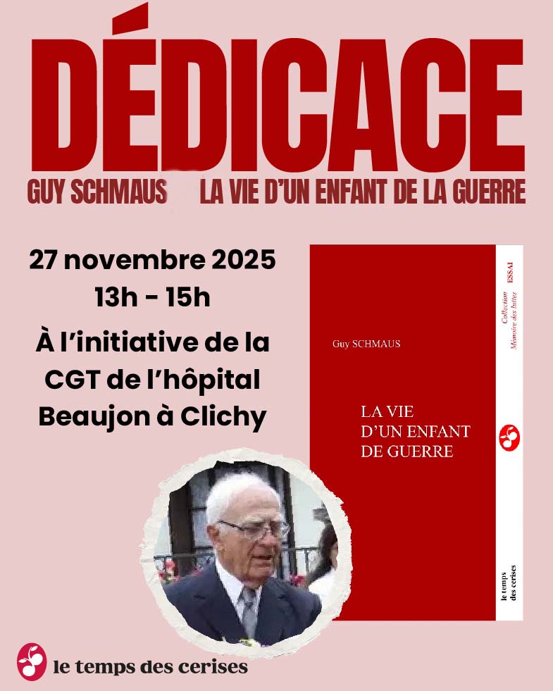 Rendez-vous le 27 novembre 2025 de 13h à 15h à l’hôpital Beaujon à Clichy, à l’initiative de la CGT, pour une rencontre et séance de dédicace autour du livre "La vie d’un enfant de la guerre", de Guy Schmaus.